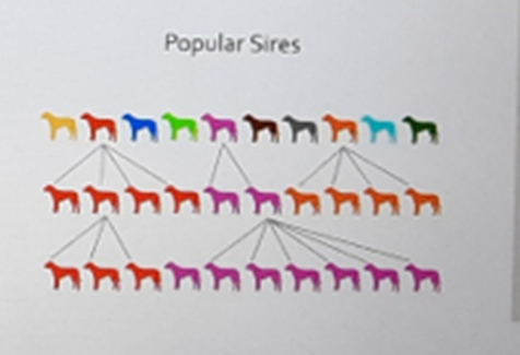 De afbeelding hieronder laat zien wat er gebeurt wanneer er maar een paar honden uit de populatie gebruikt worden voor de fok. De bovenste rij honden hebben allemaal andere genen (kleurtjes).