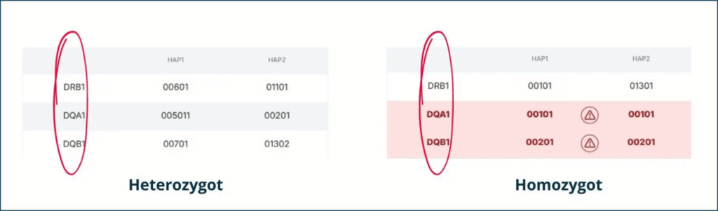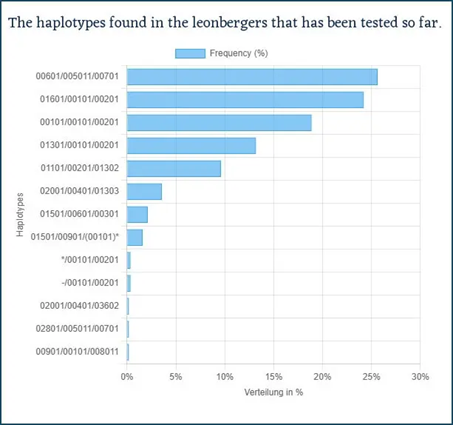 Het diagram toont verschillende DLA haplotype combinaties in geteste Leonbergers. Een hond met twee verschillende varianten (heterozygoot) heeft meer genetische diversiteit in zijn DLA-genen dan een hond met twee identieke varianten (homozygoot). Een hond die homozygoot is in zijn DLA-genen kan nog steeds een waardevolle bijdrage leveren aan de fokkerij. Als ze gepaard worden met een hond met verschillende DLA haplotypes, kunnen de nakomelingen heterozygoot worden en een bredere genetische diversiteit in hun immuunsysteem dragen. Op deze manier helpen we de genetische diversiteit in het ras in de loop van de tijd te behouden en te versterken.